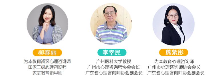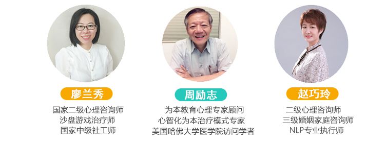 周鈺清為本教研專家導師國家二級心理咨詢師美國NGH催眠治療師中國心理健康委員會理事廣東省心理咨詢師協會理事個人簡介為幼兒園、小學、初中、高中等不同年齡段家長舉辦親子溝通講座及沙龍,加強家、校互動,結合家長、學校共同為孩子的心理成長獲取更適合的方法;對特殊兒童、問題兒童開展個體、團體心理輔導;設計不同年齡段兒童社交能力、學習能力、增強